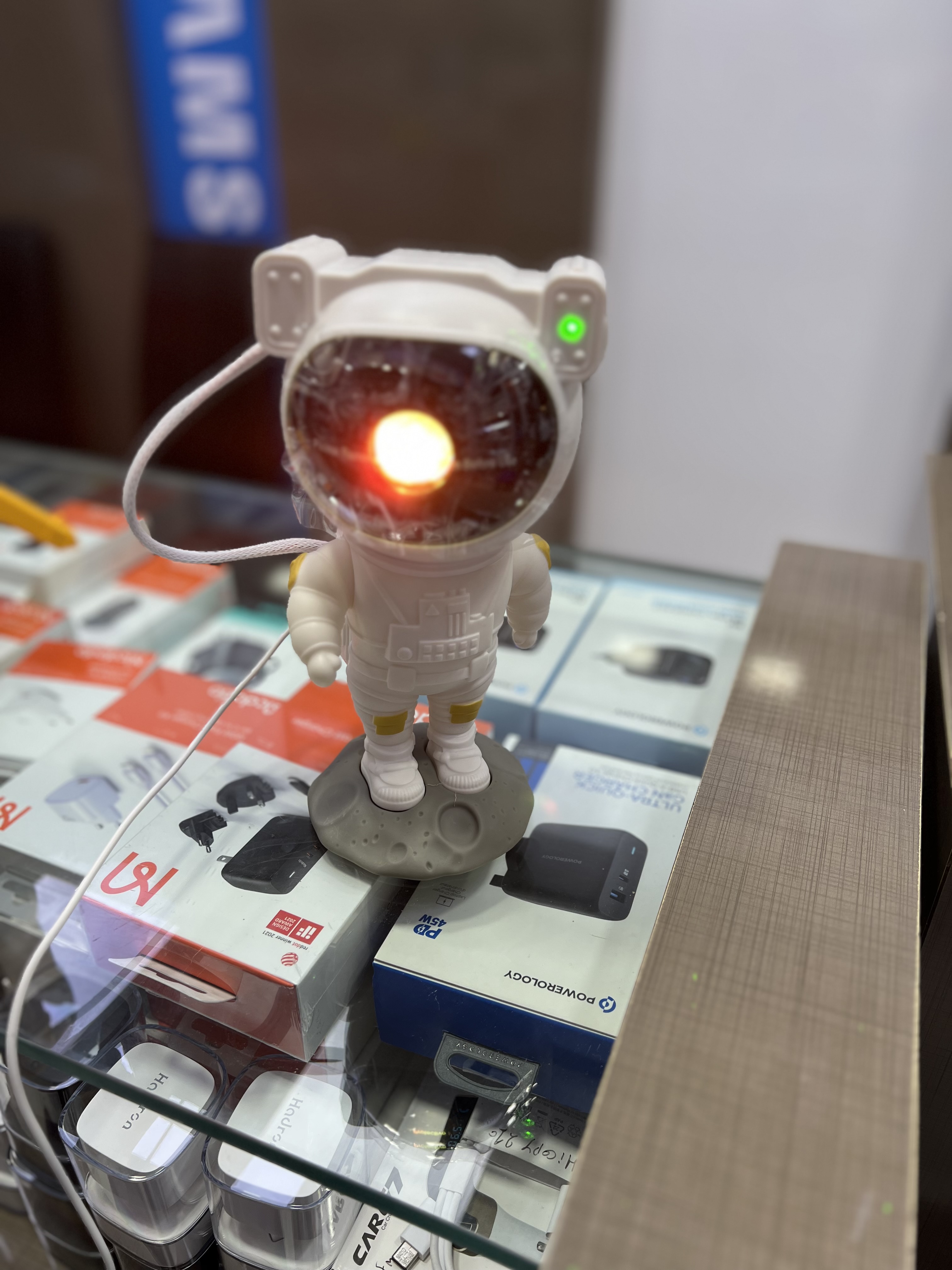• شکل ظاهری: فیگور فضانورد با کلاه فضایی بزرگ و لنز پروژکتور بهجای شیشهی کلاه